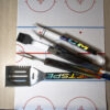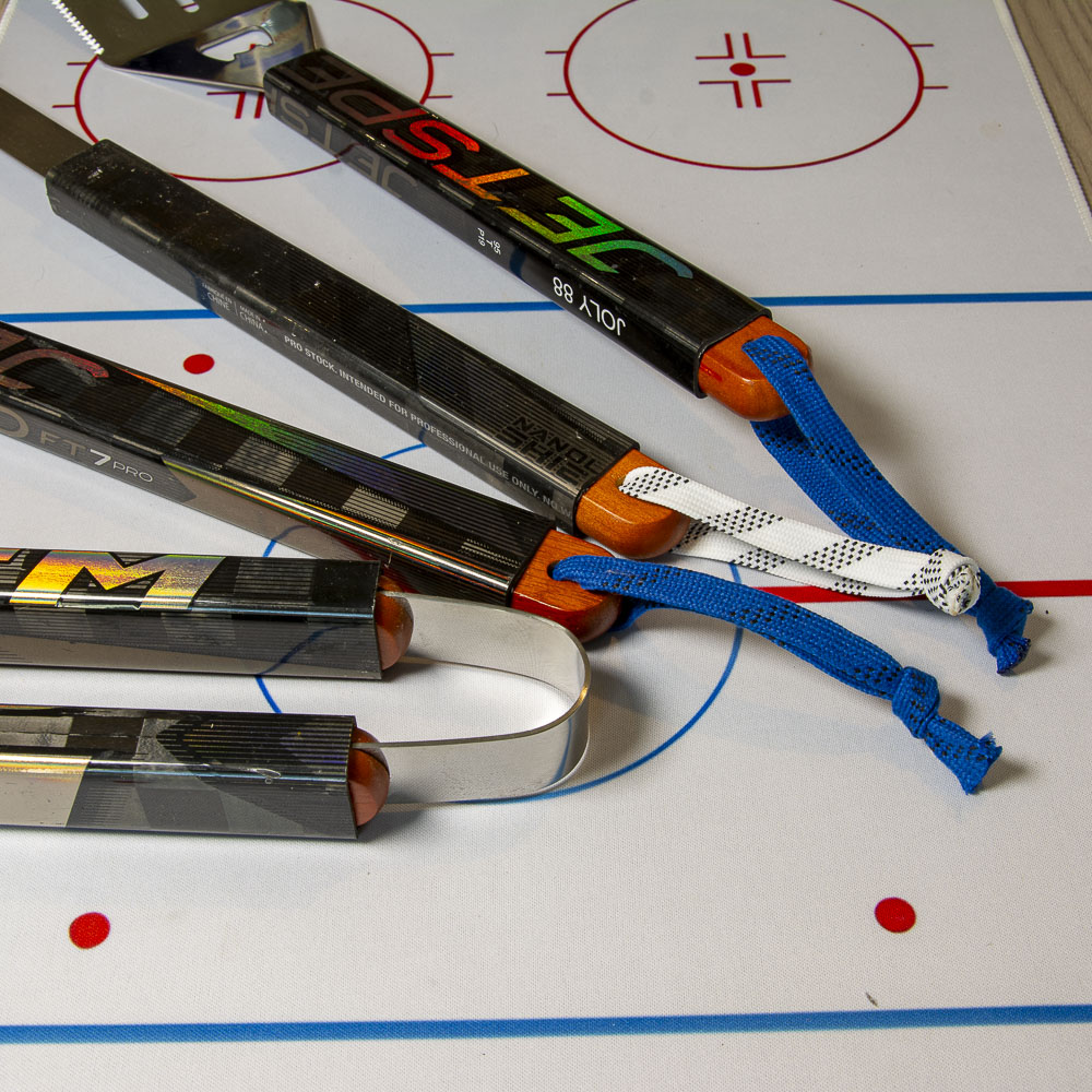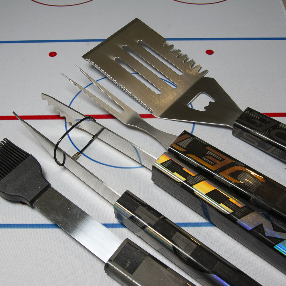 Questo set grill è formato da quattro pezzi — pinza, forcone, spatola e pennello — ognuno con un manico ricavato da veri bastoni da hockey. Resistenti, solidi, pronti a scendere in campo tra fumo, cibo e risate.